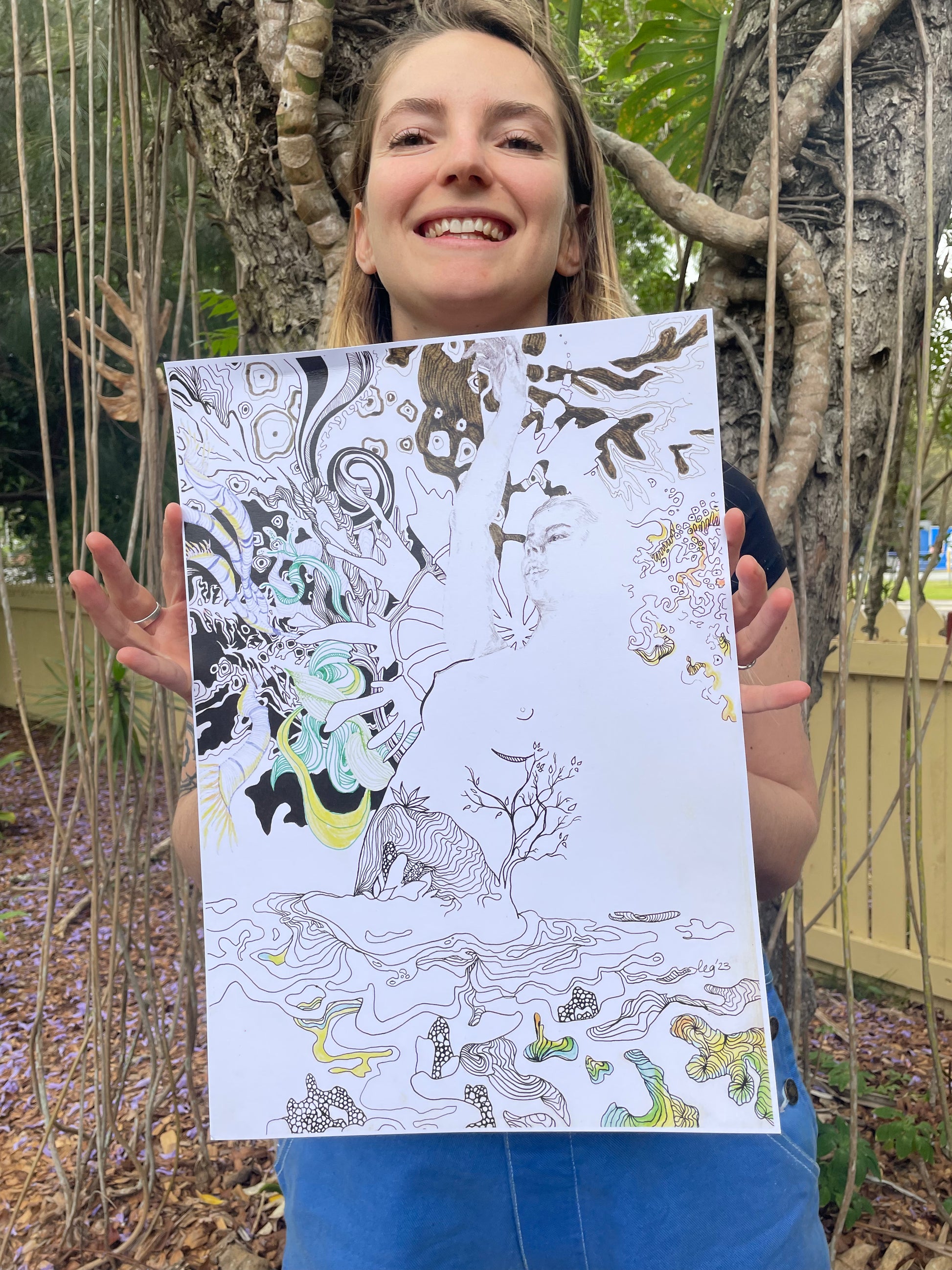 This water nymph plant lady is all about water. Water is the universal solvent of our planet, it connects all life. Not a single organism on Earth goes through existence without at some point needing water to survive and thrive. We as people are no exception. It’s in our blood, evaporates from our pores to cool us down, and it streams down our face when we cry. In fact it’s the first thing we learn how to do when we’re born; cry for help. While other species like newborn horses first learn to stand and run, we as people are inherently born needing each other to be interconnected and compassionate for one another. We gravitate towards water in times of need, to help us regulate our emotions when they threaten to overwhelm us. This artwork was inspired by the overwhelming feeling of falling in love, and surrendering to the unknown. Deeply trusting in our own ability to face ourselves as deeply as we are willing to face the other too.