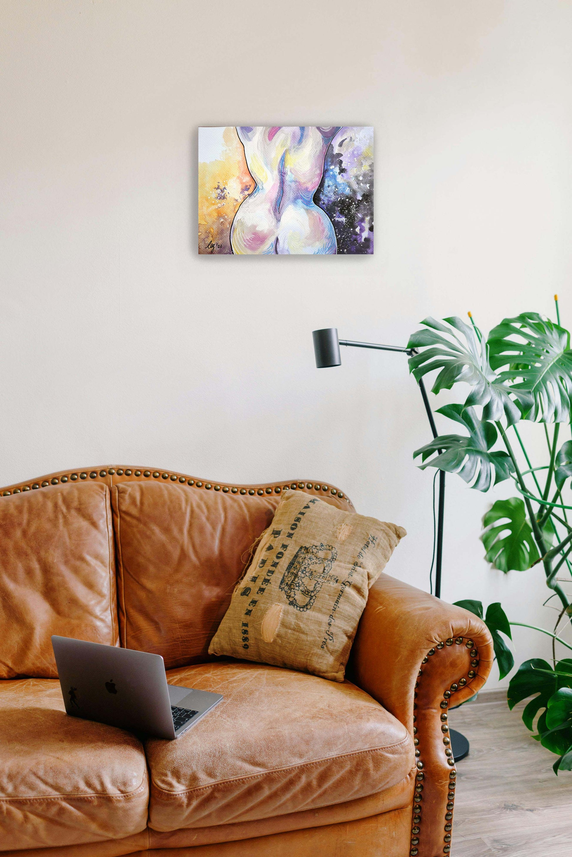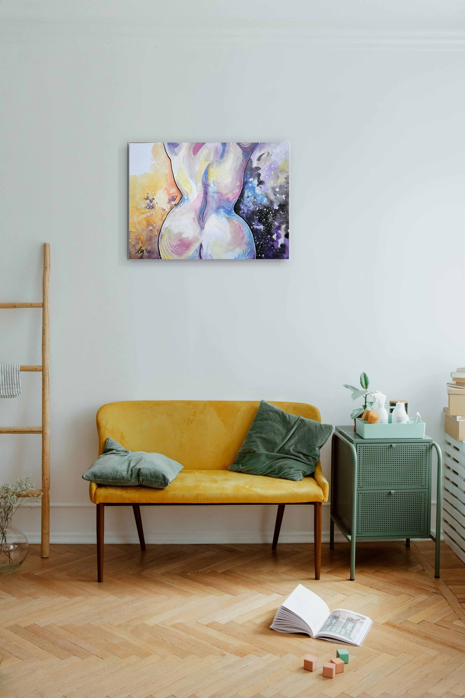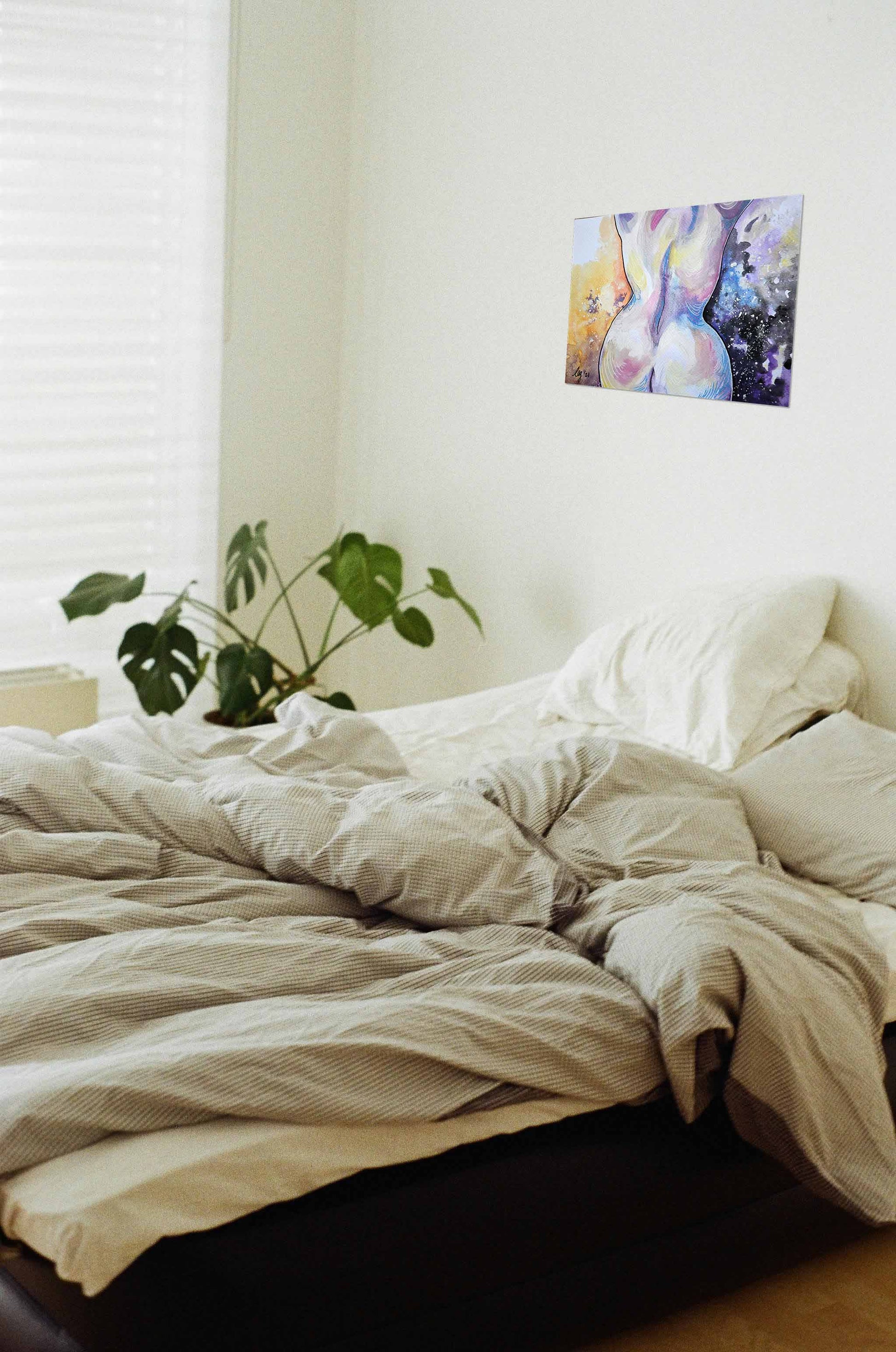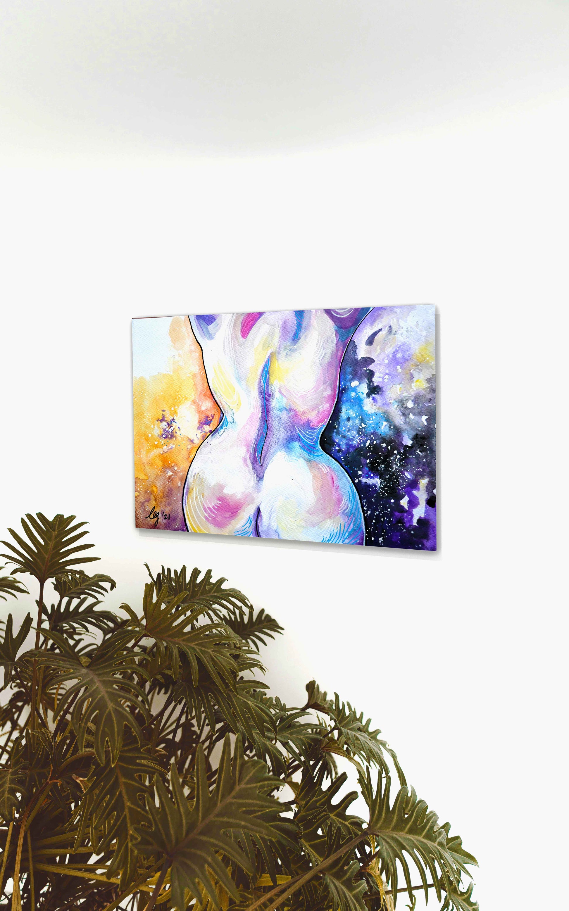 I originally made this gouache and female form inspired artwork to experiment with gouache paint for the first time. I made it look like the whole galaxy was inside and outside of this woman's figure.  Looking back I feel like this is Gaia, the mother of the universe.