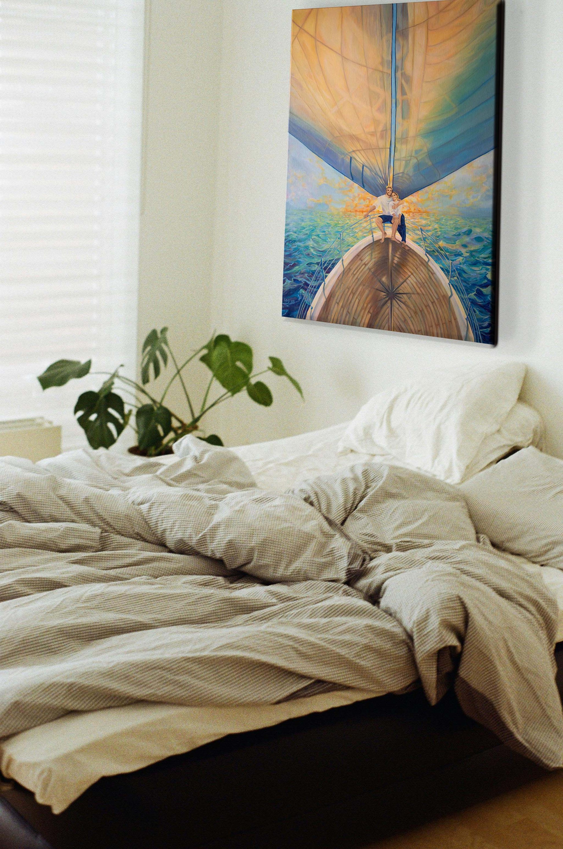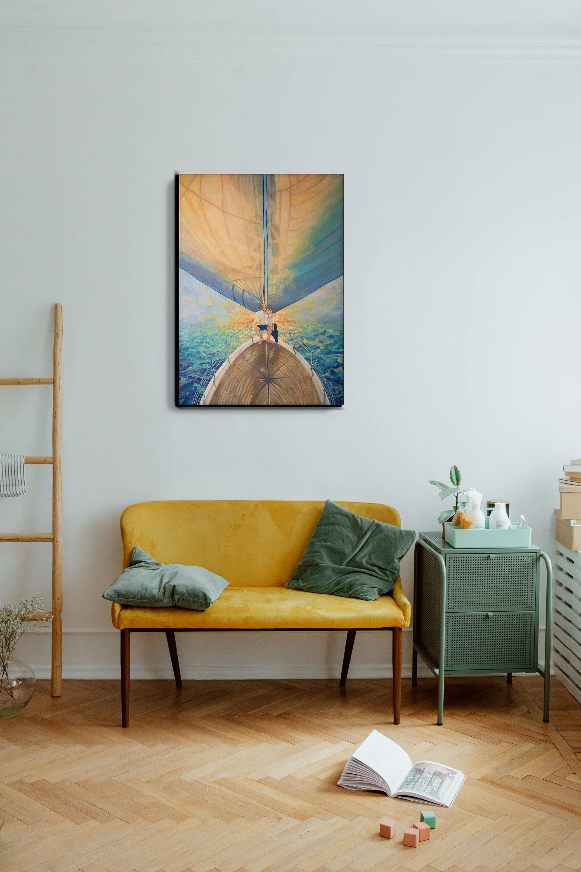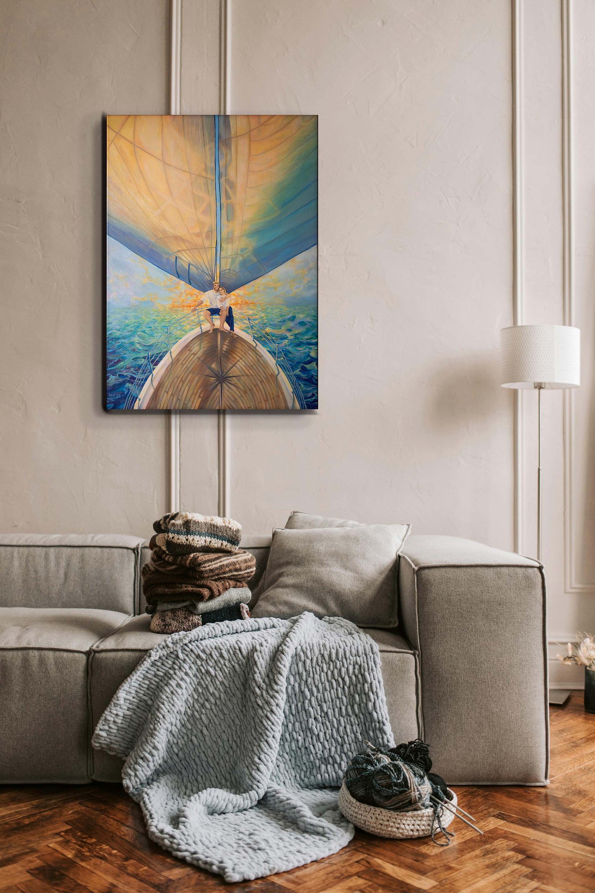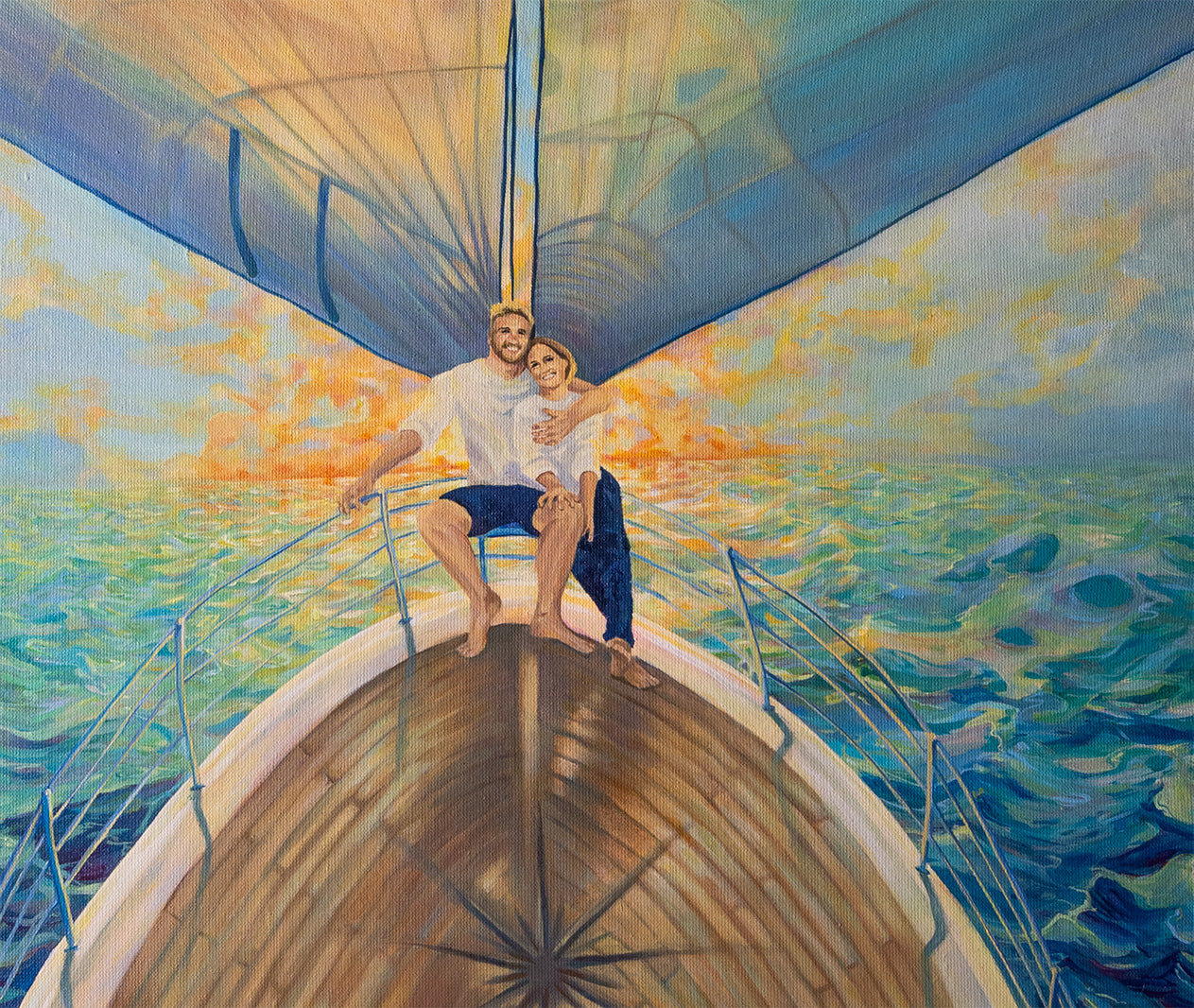 The painting was inspired by a picture taken of the couple on their boat, and it also has loads of personal hidden trinkets masked in the sails, waves, and shadows. Like little inside jokes hidden in plain sight. There's a hidden trumpet fish, a deflating alien-faced balloon, a sextant, and a compass hidden in this painting. All of which I don't know the hidden meaning of, but I love the challenge of hiding personal messages in my paintings.